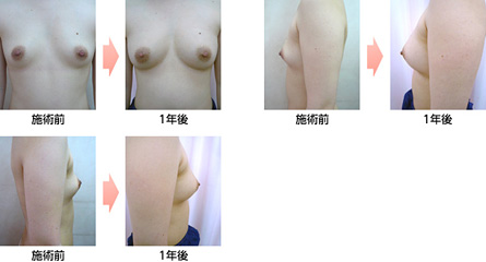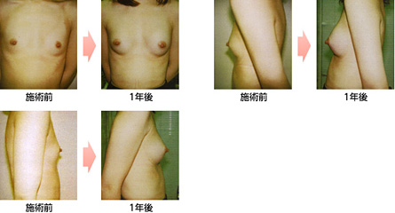 当院では、脂肪吸引が開発された80年代より、いち早く自分の脂肪を用いた脂肪注入の研究と応用に取り組み、現在では症例数は2万例を越えました。また、最近では再生医療の発達により、より確実に安全に、しかも自然に豊胸することが可能となりました。脂肪注入は、脂肪吸引により吸引した自己脂肪を脂肪移植することにより豊胸しますので、異物を入れないので発ガンなどの後遺症の心配がなく、シリコンバッグのような不自然さのない全く自然な仕上がりが可能です。しかも、胸は注射で脂肪を注入し、吸引部は3?4mmの小さな穴を開けるだけなので、傷が殆んど残りません。局所麻酔で行うので、入院不要で普通に歩いて帰宅でき、翌日にはシャワーも大丈夫ですし、軽い仕事や外出も可能です。