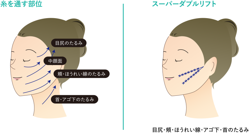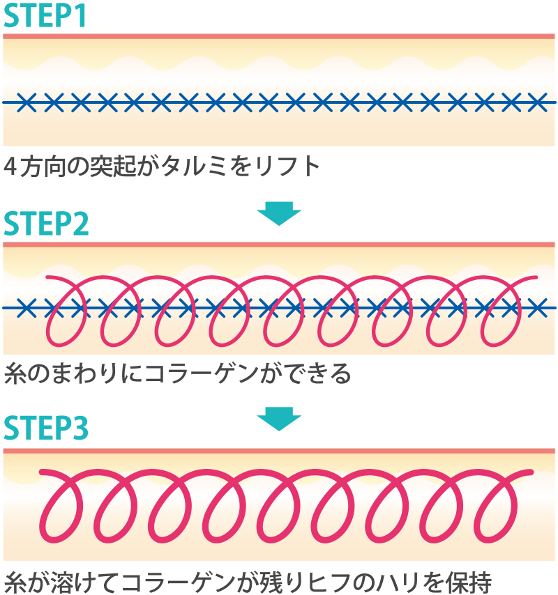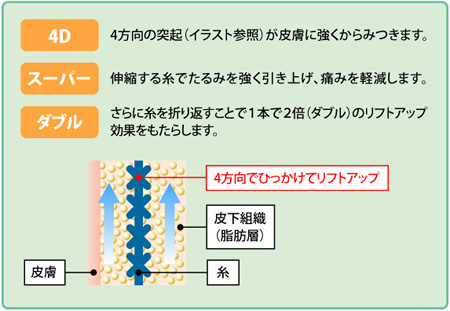 アサミ美容外科の「切らない吸収糸リフト」は、糸の毛羽立ちがたるみを持ち上げ、そのまわりにコラーゲンができて固定することでハリができ、元に戻ることなくリフトアップを維持します。 伸縮する糸の4方向の突起が、皮膚にからみつき、たるみを強く引き上げます。さらに糸を折り返すことにより、一般的なフェザーリフとの数倍の効果をもたらします。 4Dスーパーダブルリフトでは目尻、ほうれい線、頬や口周囲のタルミ、首や下あごの皮膚や組織を吊り上げ、広範囲のリフトに優れた効果があります。