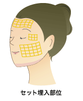 ■術後合併症 通常、ごく軽度の内出血と炎症、針穴の軽度の発赤くらいで済みます。稀なケースでは、リフト部の凹凸(エクボ)や顔の左右非対称、瘢痕の拘縮等の報告がありますが、多くは数カ月以内に自然解消します。 非常に稀なものとしては、施術部位に一過性の感覚異常や感染(化膿)があります。 万一感染(化膿)が起こった場合には、埋入した金の糸を抜去しなければならない場合があります。