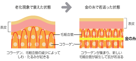 ■金の糸美容術の効果 金の糸美容術は、クレオパトラが施術されていたとして最近話題になっている、特殊な高純度(純度99.99)純金の糸を用いた究極の若返り術です。 当院の金の糸は、純金糸の効果をより高める素材を補助糸として編み込んだものです。 埋入した金の糸の周囲にコラーゲンやエラスチンなどが増殖され、毛細血管の再生と組織や細胞の新陳代謝の促進効果があると報告されています。即ち、肌に有害な老廃物や細菌および活性酸素などが、賦活された血流と免疫システムによって取り除かれ、皮下の組織が再生し活性化するため、見かけだけではなく本当に肌年齢が若返るのです。 これにより肌の若返りはもちろん肌の老化に伴うたるみに効果的なのです。 リフト効果の程度は、メスを用いるフェイスリフト手術の方がやや優勢で個人差もありますが、アプトスやワプトスなどと同時に行うことで同様な効果が期待できます。 また術後のリスクや合併症、制限事項、ダウンタイムが圧倒的に少ないのが特徴です。